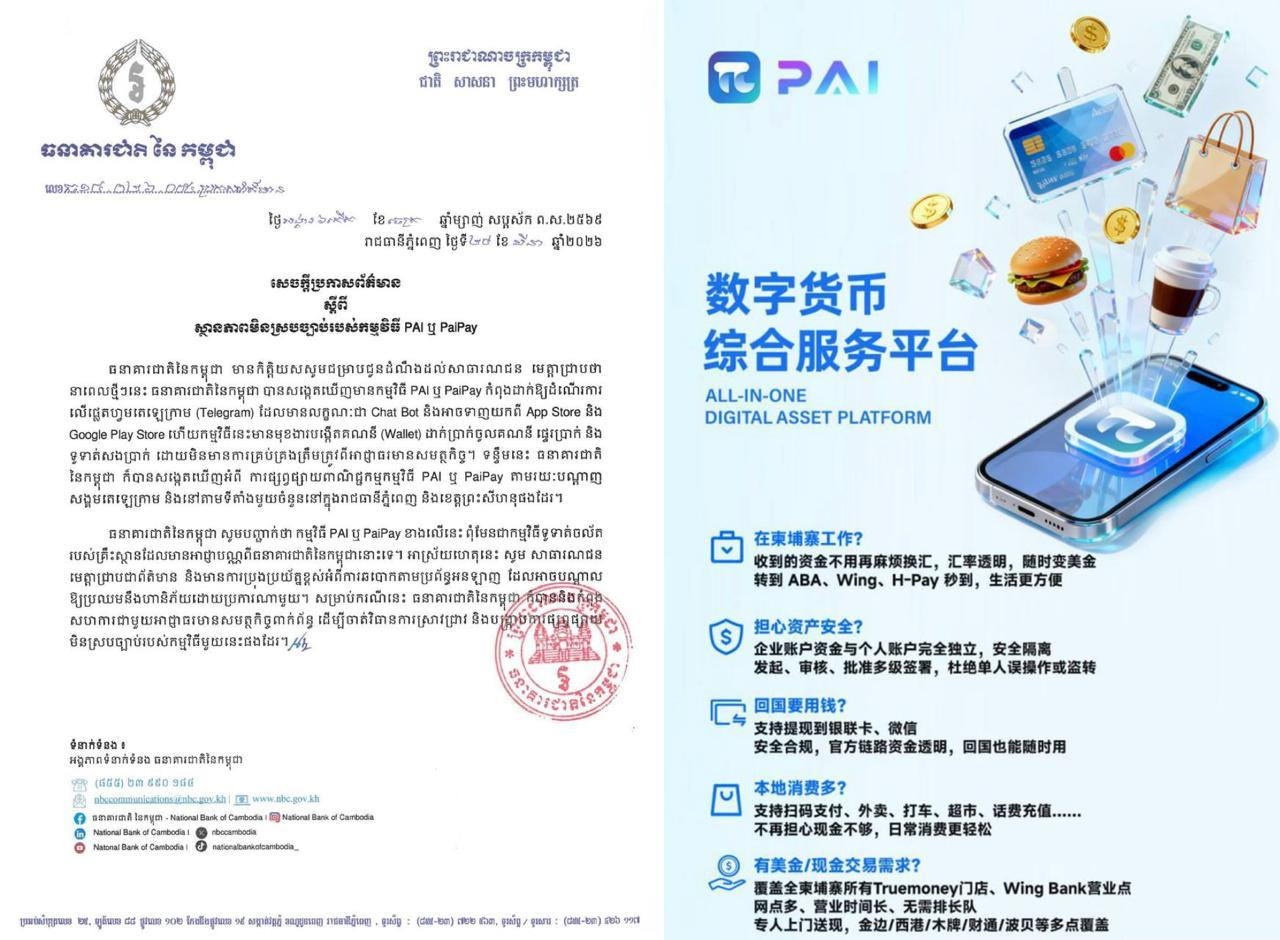 目前,柬埔寨国家银行已联合相关执法及监管单位,对“PAI / PaiPay”的宣传渠道及实际运营情况展开全面调查,并同步推进打击措施。官方再次强调,公众应优先选择受监管、具备合法资质的金融机构或支付工具,切勿轻信来源不明的电子钱包,以免造成不必要的经济损失。