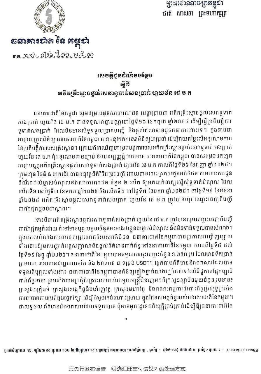 柬埔寨国家银行表示,相关材料已完成法律审查,并与司法部、经济财政部、内政部及打击网络犯罪委员会等多个部门进行磋商。但综合评估认为,现有证据不足以支持其采取进一步行政行动。